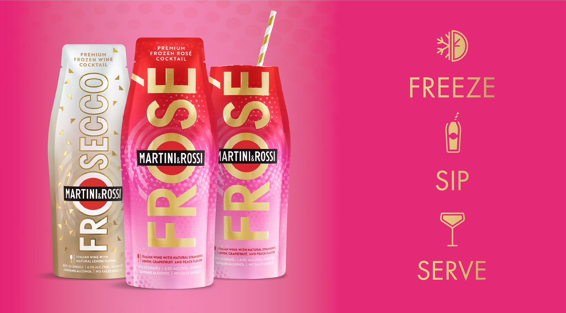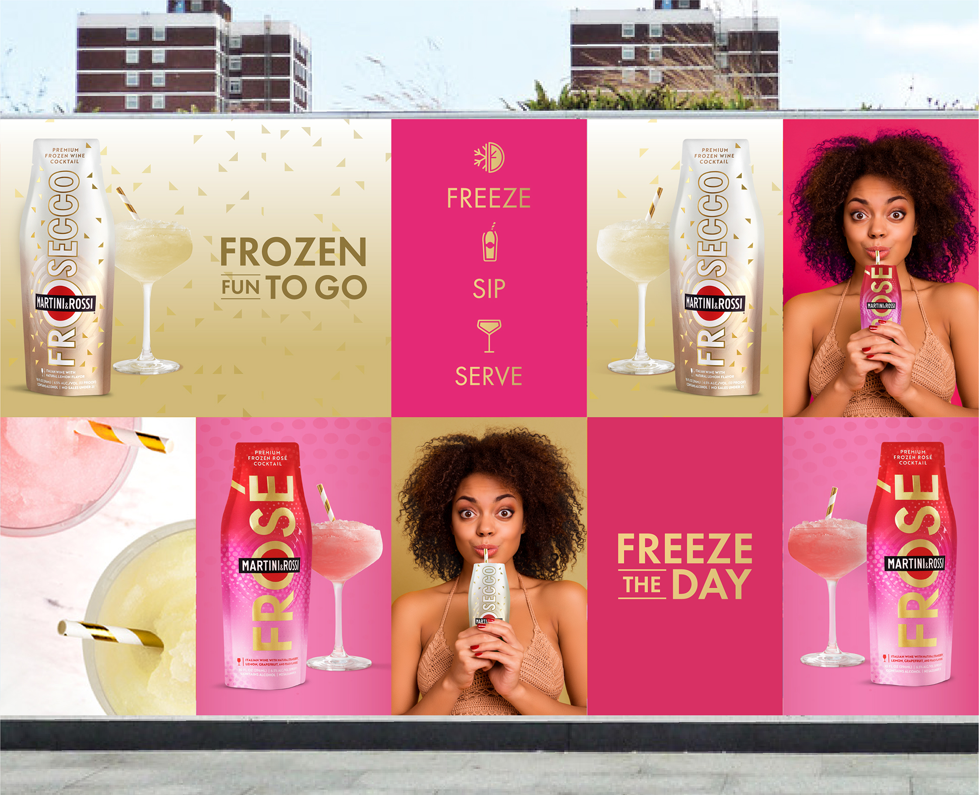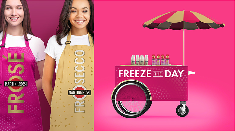 Capture consumer’s imagination and expand the ready to drink cocktail occasion for a truly unique Martini&Rossi Frosé moment. Elevate the signature Frosé colors, adding in bold graphics and gold accents to highlight this premium offering. Develop eye-catching in store launch materials to draw in our consumers and highlight the versatile nature of this RTD — going where the Rosé bottle has never gone before.