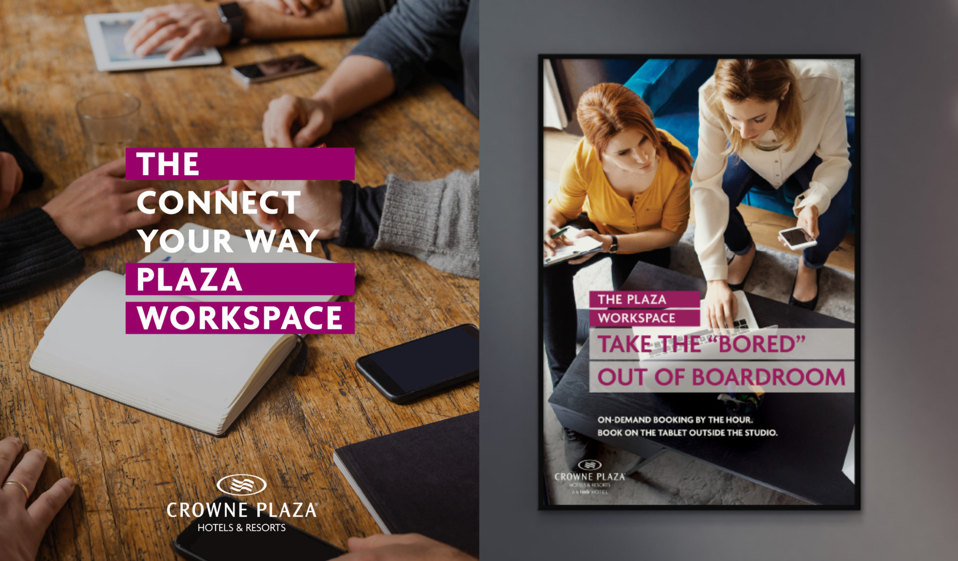 We began by mapping the guest journey, identifying opportunities to connect with our consumer in a meaningful manner. Inspired by the Crowne Plaza New Modern design philosophy, Stag&Hare developed a brand identity, visual design language, and messaging strategy intended to resonate with today’s “always on” workforce. We brought the concept to life across in-hotel advertising, in-room communications, signage and digital applications by introducing and clarifying what makes the Plaza Workspace different and why it was tailored to fit their needs.