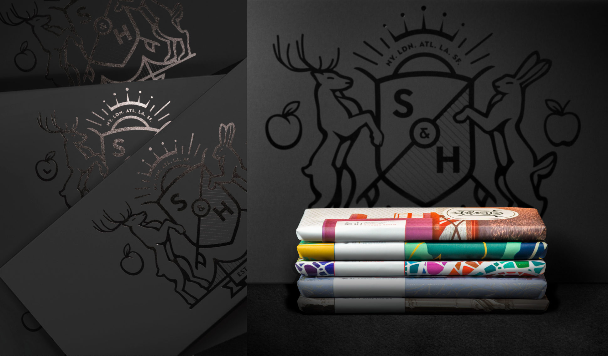 In partnership with XOCOLATL, an Atlanta-based artisan chocolatier, we created a set of five, limited edition chocolate bars representing our office locations. Each bar delivers a multi sensorial experience—from sight to touch to taste—and tells a singular visual story of place and personality. Anchored by a bespoke office crest, the designs graphically explore what makes each office special and unique to Stag&Hare. Presented together in a stunning gift box, the story of Stag&Hare deliciously unfolds.